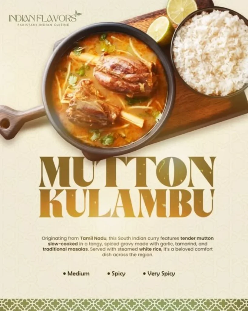 Mutton Kulambu is a South Indian-style curry made with goat meat. The gravy is made with tamarind, chili, and other ground spices. It tastes slightly tangy and spicy. The meat is cooked until soft. This dish is usually enjoyed with plain rice and is popular for its bold flavors and sourness.